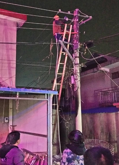 東辛“電雷鋒”們在寒夜接到故障消息后,第一時間趕赴現場,他們克服道路冰凍行走困難、電桿覆冰攀爬濕滑等不利因素,頂著刺骨的寒風,咬緊牙關一步一個腳印,仔細進行設備檢查和維修,在桿上艱難地完成每一個動作,一刻也沒有停歇,以最快速度搶修受損線路恢復居民用電。