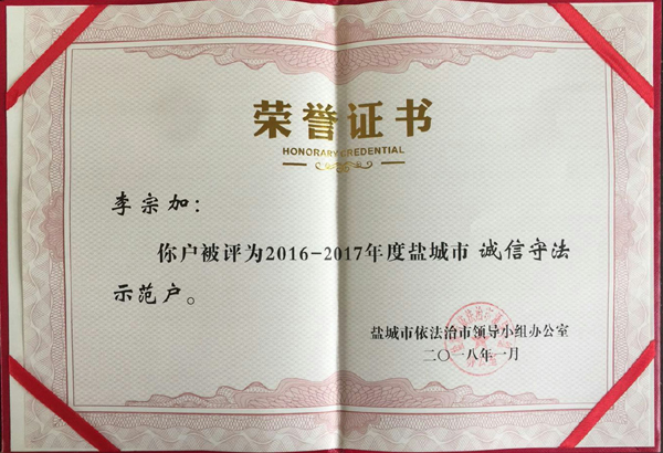 近日傳來(lái)喜訊,新洋農(nóng)場(chǎng)有限公司李宗加、朱雪芹、王毓松三戶職工家庭被評(píng)為射陽(yáng)縣“誠(chéng)信守法示范戶”,其中李宗加還被評(píng)為鹽城市“誠(chéng)信守法示范戶”。