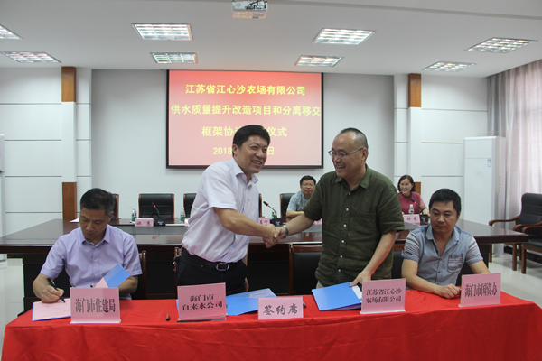 6月21日下午,江心沙農場有限公司在二樓會議室舉行供水質量提升改造項目和分離移交框架協議簽訂儀式。公司領導許嘉寧、嚴忠、朱忠偉、楊慧,海門市住建局副局長沈雪松、市自來水公司總經理施惠、市國資辦科長曹永杰及農場公司部門負責人、自來水廠全體工作人員參加了簽約儀式。公司副總經理楊慧主持簽約儀式。