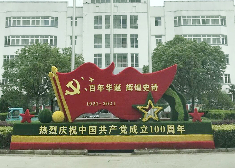 早在5月份,一組熱烈慶祝中國共產黨成立100周年的綠雕就將辦公樓前的花壇裝點一新。根據慶祝建黨100周年氛圍營造方案,近期,施工人員抓緊對350省道小城鎮段、裕源大道、建場路的燈桿上安裝印有“中國夢”字樣的中國結景觀燈,同時穿插“不忘初心,牢記使命”、“砥礪奮進,追夢前行”、“聽黨話,跟黨走”以及企業精神的道旗和宣傳標語等,營造出一派紅色、熱烈、喜慶、向上的濃厚氛圍