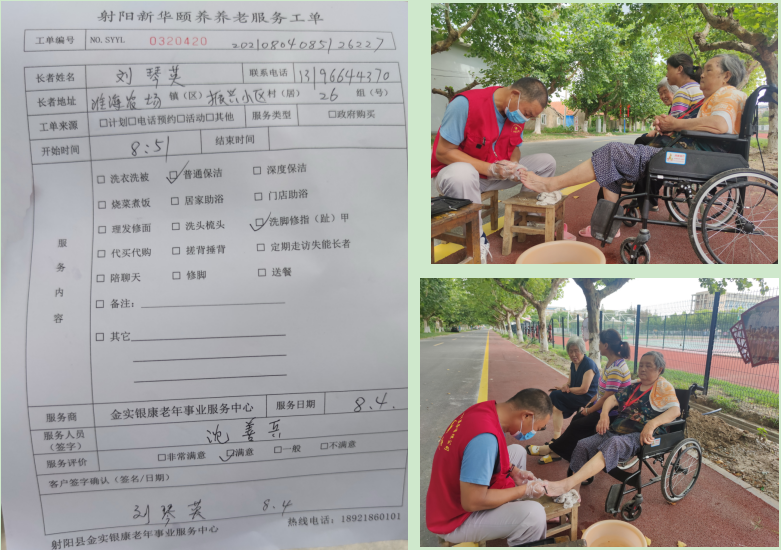 交談中,這位居住在農場城西居委會振興小區26號,88歲的居民劉琴英,在享受到一個小時的居家普通保潔和洗腳修指(趾)甲服務后很是開心。“感謝金實銀康和農場社區居家養老給我們老年人帶來的服務,感謝護理員沈善兵對我提供無微不至的關心服務。”