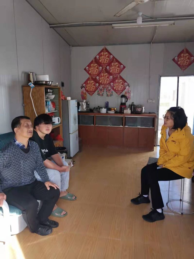 她出月子后,于10月17日帶著慰問金、大米、食用油等和李書記一起來到虞道虎家探望。通過深入交流了解到,他媽媽是外地人,在他4歲的時(shí)候拋下他就再也沒有回來,他爸爸身體殘疾又患有糖尿病伴隨著并發(fā)癥,致使視力嚴(yán)重下降模糊看不清,原先還能靠開三輪車帶乘客掙點(diǎn)微薄的生活費(fèi),現(xiàn)如今也只能作罷,面對(duì)如此不堪重負(fù)的家庭生活和上學(xué)的雙重壓力,家庭收入幾乎為零,經(jīng)過村、鎮(zhèn)的申請,縣政府相關(guān)部門的審批,最終他爸爸獲得了殘疾補(bǔ)貼和民政低保收入,家庭全部收入也僅限于此。“黨員媽媽”王靖與虞道虎的交談中,得知他本人對(duì)未來很有想法,目前就讀于揚(yáng)州技師學(xué)院,五年制大專,數(shù)控專業(yè),他計(jì)劃好好學(xué)習(xí)順利畢業(yè)后將專轉(zhuǎn)本,繼續(xù)學(xué)歷深造以便日后好去蘇南就業(yè),考慮蘇南相對(duì)高工資可以為窮困的家庭和年邁的父親減輕壓力。聽此,王靖很欣慰,勸導(dǎo)父親和虞道虎,困難是有,但是暫時(shí)的,只要虞道虎肯努力學(xué)習(xí),保持積極樂觀的心態(tài),未來一定可期。