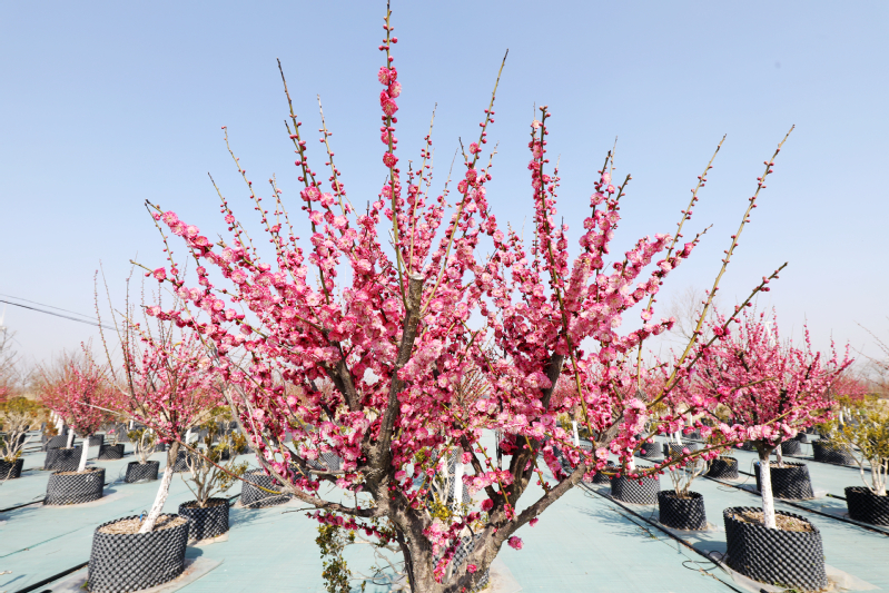 “這片紅梅共有300多棵,其樹形、樹冠和花色,都是我們精心挑選和培育的,目前的市場價值也逐漸凸顯。”新洋林業(yè)公司負責人高翔介紹。