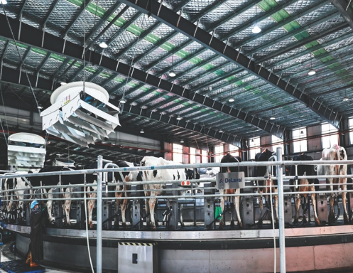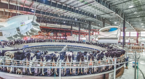 在連云港市東辛農(nóng)場萬頭牧場內(nèi),兩臺80位轉(zhuǎn)盤式奶牛擠奶設(shè)備正在運行,科學(xué)擠奶方式既降低了人力成本,更使擠奶效率大幅提高,全程機(jī)器操作,避免人工污染,從源頭保障奶品品質(zhì)。