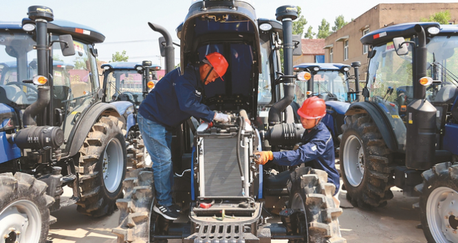 連日來,連云港市海州區崗埠農場農機總站組織工作人員,對農機及農具進行全面檢查、維護、修理、保養,了解新設備的性能和操作方法,為即將到來的“三夏”大忙做好準備。圖為5月23日,工作人員正在檢修一批農機。 耿玉和 王貴珍 攝 (視覺江蘇網供圖)