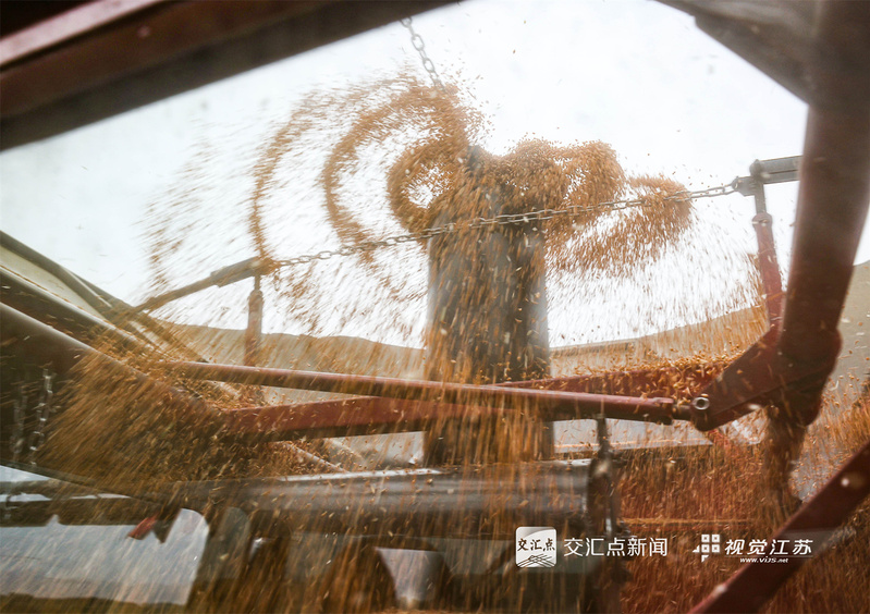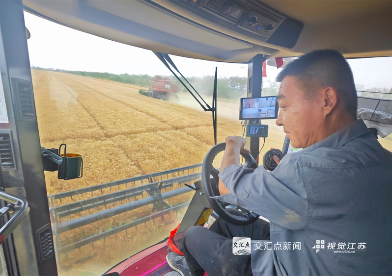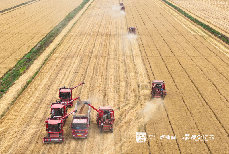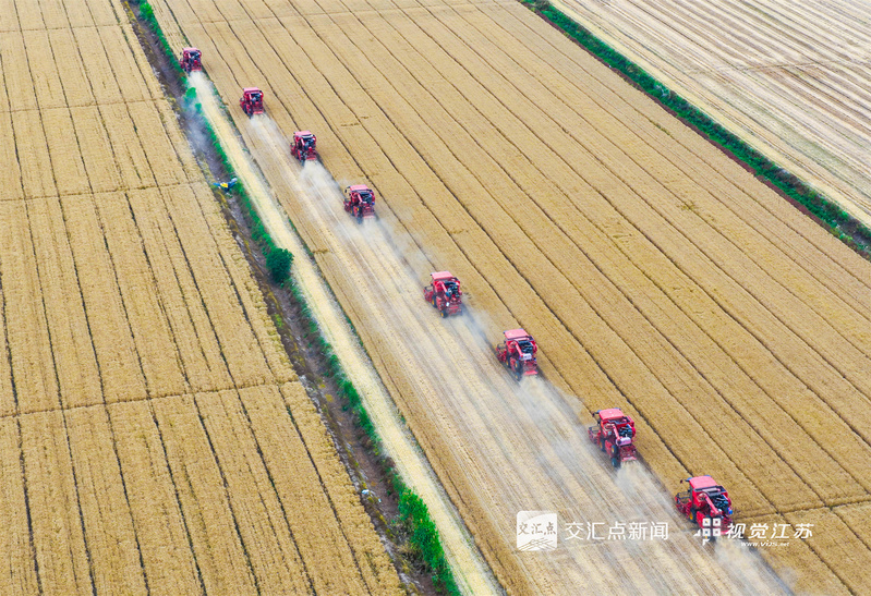 (特約攝影  許昌銀  錢厚紅  15:24攝  20:39上線)五月的麥田,金穗飄香。5月26日,淮安盱眙洪澤湖畔的江蘇農墾三河農場的3.82萬畝小麥開鐮收割。當地利用晴好天氣加緊收割,確保顆粒歸倉。