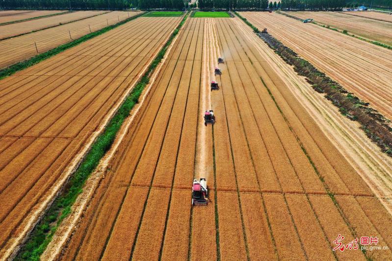 2025年6月4日,江蘇省連云港市海州區(qū)的江蘇農(nóng)墾崗埠農(nóng)場利用晴好天氣搶收成熟的小麥,現(xiàn)場五臺收割機(jī)一字排開,馳騁在金色的小麥田里,田間地頭一片繁忙豐收景象。(徐衛(wèi)攝)