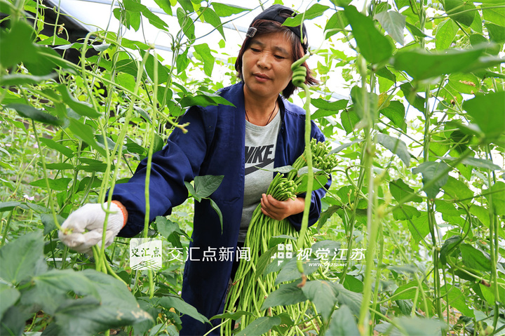 9月17日,連云港市海州區的江蘇農墾崗埠農場,種植戶在溫室大棚里采收成熟的豇豆,準備供應市場銷售。徐衛  攝  視覺江蘇網供圖