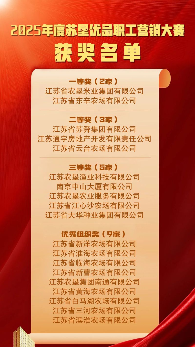 以賽促學、以賽促銷、以賽育人。2025年“蘇墾優品”職工營銷大賽雖已圓滿落幕,但大賽所點燃的學習熱情、營銷活力與育人能量仍在持續涌動。江蘇農墾以此次大賽為契機,進一步整合資源、優化平臺,持續強化“以賽促學”賦能職工成長、“以賽促銷”拓展市場空間、“以賽育人”鍛造骨干梯隊,推動電商新業態與農業主業深度融合,奮力書寫現代農業品牌化、數字化發展的新篇章。