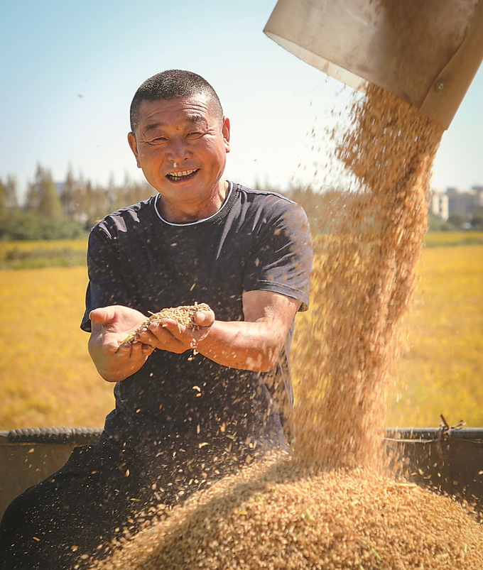 10月10日,南通市海門區(qū),江蘇農(nóng)墾江心沙農(nóng)場(chǎng)500余畝“低GI”功能性水稻喜迎豐收。