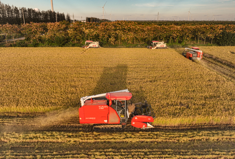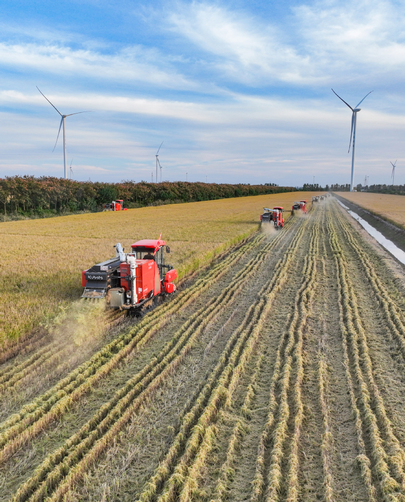 11月3日,江蘇省鹽城市射陽縣新洋農場組織收割機械,對高標準農田中的優質水稻進行搶收作業,確保秋糧顆粒歸倉,不誤農時。   作者:張偉生