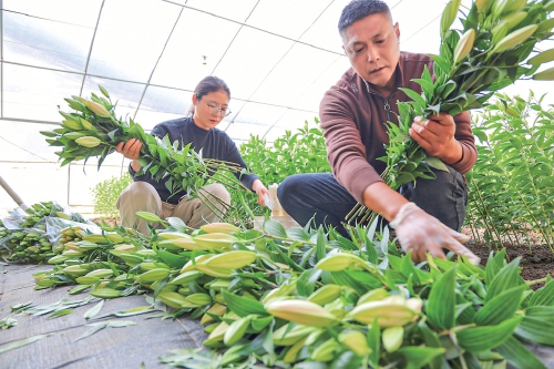 寒冬時節(jié),江蘇農(nóng)墾崗埠農(nóng)場高效農(nóng)業(yè)示范園11號大棚內(nèi)一片春意盎然。一株株百合花挺拔站立,不少花苞已露出粉色,在綠葉的襯托下格外嬌艷動人。去年,崗埠農(nóng)場高效農(nóng)業(yè)示范園大力發(fā)展鮮切花產(chǎn)業(yè),引進(jìn)了“中國紅”“索蚌”等百合花品種,共種植14萬株。通過為周邊種植戶提供技術(shù)指導(dǎo),農(nóng)場帶動大家發(fā)展鮮切花產(chǎn)業(yè)。圖為工作人員正在整理百合鮮切花。