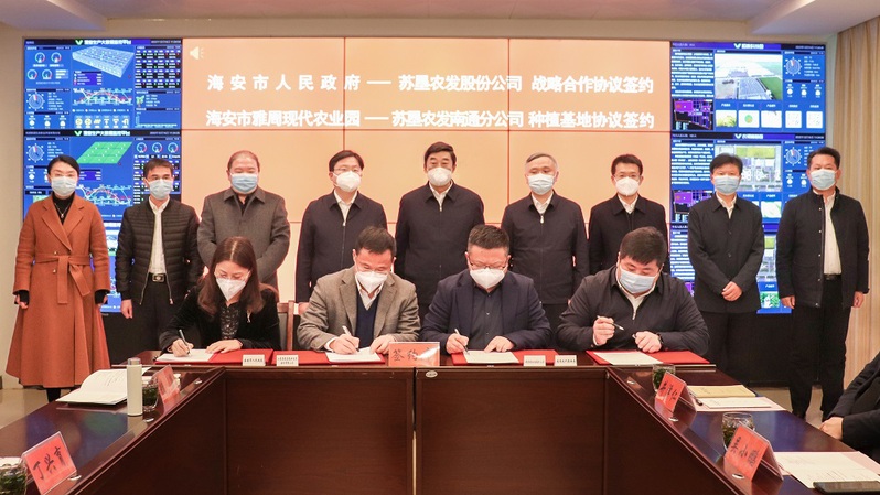 12月16日上午,蘇墾農(nóng)發(fā)股份公司與海安市人民政府戰(zhàn)略合作協(xié)議簽署儀式在海安雅周現(xiàn)代農(nóng)業(yè)園舉行。集團(tuán)公司黨委副書記、總經(jīng)理胡兆輝,海安市市長(zhǎng)譚真出席儀式并致辭,蘇墾農(nóng)發(fā)股份公司總裁與海安市副市長(zhǎng)分別代表雙方簽署戰(zhàn)略合作協(xié)議。胡兆輝對(duì)海安市長(zhǎng)期以來(lái)給予江蘇農(nóng)墾的關(guān)心支持表示感謝,向協(xié)議的簽署表示祝賀,并介紹了集團(tuán)公司歷史沿革和改革發(fā)展取得的顯著成效。胡兆輝指出,雙方長(zhǎng)期保持著密切合作,共同肩負(fù)保障國(guó)家糧食安全的政治責(zé)任,在建設(shè)高標(biāo)準(zhǔn)農(nóng)田、創(chuàng)建國(guó)家現(xiàn)代農(nóng)業(yè)產(chǎn)業(yè)園、打造全省一流的糧食生產(chǎn)示范基地等方面目標(biāo)吻合、方向一致。今年以來(lái),雙方繼續(xù)深化合作,積極推動(dòng)建立蘇墾農(nóng)發(fā)南通分公司海安基地,著力打造輻射帶動(dòng)周邊的綠色稻米產(chǎn)業(yè)基地、糧油輪作示范基地、現(xiàn)代農(nóng)業(yè)示范基地。胡兆輝表示,雙方要緊緊圍繞黨的二十大精神,沿著習(xí)近平總書記指引的方向深耕農(nóng)村、深化合作,實(shí)現(xiàn)資源共享、優(yōu)勢(shì)互補(bǔ),共擴(kuò)種植規(guī)模、共建種繁基地、共創(chuàng)示范效應(yīng),攜手打造省屬國(guó)企和地方合作的標(biāo)桿典范。譚真代表海安市委市政府對(duì)胡兆輝一行的到來(lái)表示歡迎,對(duì)江蘇農(nóng)墾長(zhǎng)期以來(lái)關(guān)心支持海安“三農(nóng)”事業(yè)發(fā)展表示感謝。譚真表示,雙方戰(zhàn)略合作的達(dá)成,將對(duì)海安