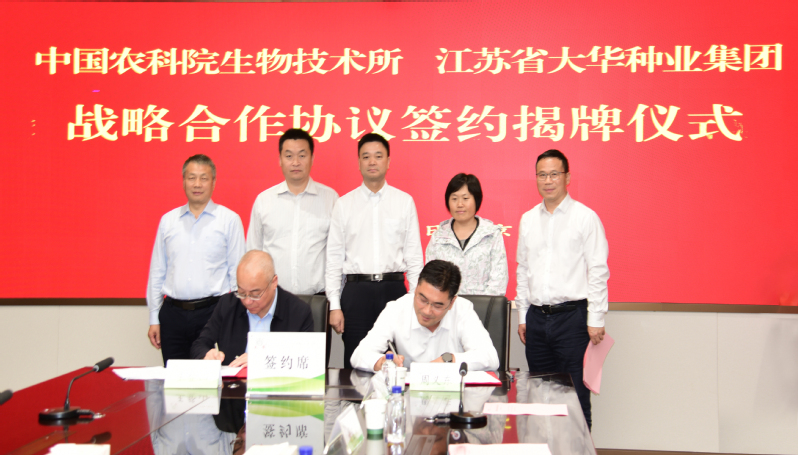 11月15日下午,大華種業與中國農科院生物技術研究所戰略合作協議簽約暨中國農科院生物技術研究所大華種業研發基地揭牌儀式在南京舉行。集團黨委副書記、總經理姜建友出席儀式并致辭,中國農科院生物技術研究所所長、黨委副書記王登山出席儀式并講話,集團公司總經濟師朱亞東主持儀式。姜建友對王登山一行的到來表示歡迎。他表示,中國農科院生物技術研究所是從事農業生物技術領域基礎研究、應用基礎研究和高新技術研究的國家級科研機構,多年來在作物功能基因組、作物分子生物學等領域取得了一系列重要創新成果。大華種業作為蘇墾農發種業板塊的載體,在農作物種子研發、繁育、生產和市場推廣等方面具有明顯優勢。期待雙方深化提升全面戰略合作,充分發揮各自優勢,積極打造中國農科院生物技術研究所大華種業研發基地,加快農作物新品種試驗示范及成果推廣應用,探索共建聯合實驗室,推動在基因組測序、基因型檢測、多組學生物信息分析以及轉基因性狀創制等方面取得實質性成效,共同打造產研合作示范標桿,為加快推動現代農業高質量發展,打造種源科技創新策源地、新質生產力重要實踐地作出新的更大貢獻。王登山感謝江蘇農墾對中國農科院生物技術研究所的信任和支持。他表