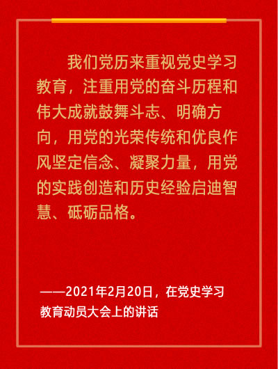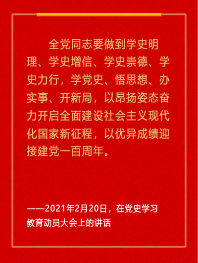 新華社北京2月20日電 黨史學習教育動員大會20日上午在北京召開。中共中央總書記、國家主席、中央軍委主席習近平出席會議并發表重要講話。他強調,在全黨開展黨史學習教育,是黨中央立足黨的百年歷史新起點、統籌中華民族偉大復興戰略全局和世界百年未有之大變局、為動員全黨全國滿懷信心投身全面建設社會主義現代化國家而作出的重大決策。全黨同志要做到學史明理、學史增信、學史崇德、學史力行,學黨史、悟思想、辦實事、開新局,以昂揚姿態奮力開啟全面建設社會主義現代化國家新征程,以優異成績迎接建黨一百周年。  中共中央政治局常委李克強、栗戰書、汪洋、趙樂際、韓正,國家副主席王岐山出席會議,中共中央政治局常委王滬寧主持會議。  習近平強調,我們黨歷來重視黨史學習教育,注重用黨的奮斗歷程和偉大成就鼓舞斗志、明確方向,用黨的光榮傳統和優良作風堅定信念、凝聚力量,用黨的實踐創造和歷史經驗啟迪智慧、砥礪品格。黨的十八大以來,黨中央高度重視學習黨的歷史,提出了一系列要求。在慶祝我們黨百年華誕的重大時刻,在“兩個一百年”奮斗目標歷史交匯的關鍵節點,在全黨集中開展黨史學習教育,正當其時,十分必要。  習近平指出,我們黨的一百年,是矢志踐行初心使命的一百年,是篳路藍縷奠基立業的一百年,是創造輝煌開辟未來的一百年。回望過往的奮斗路,眺望前方的奮進路,必須把黨的歷史學習好、總結好,把黨的成功經驗傳承好、發揚好。在全黨開展黨史學習教育,是牢記初心使命、推進中華民族偉大復興歷史偉業的必然要求,是堅定信仰信念、在新時代堅持和發展中國特色社會主義的必然要求,是推進黨的自我革命、永葆黨的生機活力的必然要求。黨中央已經印發了《關于在全黨開展黨史學習教育的通知》,對這項工作作出了部署,各級黨委(黨組)要認真貫徹落實。  習近平強調,我們黨的歷史,就是一部不斷推進馬克思主義中國化的歷史,就是一部不斷推進理論創新、進行理論創造的歷史。一百年來,我們黨堅持解放思想和實事求是相統一、培元固本和守正創新相統一,不斷開辟馬克思主義新境界,產生了毛澤東思想、鄧小平理論、“三個代表”重要思想、科學發展觀,產生了新時代中國特色社會主義思想,為黨和人民事業發展提供了科學理論指導。要教育引導全黨從黨的非凡歷程中領會馬克思主義是如何深刻改變中國、改變世界的,感悟馬克思主義的真理力量和實踐力量,深化對中國化馬克思主義既一脈相承又與時俱進的理論品質的認識,特別是要結合黨的十八大以來黨和國家事業取得歷史性成就、發生歷史性變革的進程,深刻學習領會新時代黨的創新理論,堅持不懈用黨的創新理論最新成果武裝頭腦、指導實踐、推動工作。  習近平指出,在一百年的奮斗中,我們黨始終以馬克思主義基本原理分析把握歷史大勢,正確處理中國和世界的關系,善于抓住和用好各種歷史機遇。要教育引導全黨胸懷中華民族偉大復興戰略全局和世界百年未有之大變局,樹立大歷史觀,從歷史長河、時代大潮、全球風云中分析演變機理、探究歷史規律,提出因應的戰略策略,增強工作的系統性、預見性、創造性。  習近平指出,我們黨的百年歷史,就是一部踐行黨的初心使命的歷史,就是一部黨與人民心連心、同呼吸、共命運的歷史。歷史充分證明,江山就是人民,人民就是江山,人心向背關系黨的生死存亡。贏得人民信任,得到人民支持,黨就能夠克服任何困難,就能夠無往而不勝。要教育引導全黨深刻認識黨的性質宗旨,堅持一切為了人民、一切依靠人民,始終把人民放在心中最高位置、把人民對美好生活的向往作為奮斗目標,推動改革發展成果更多更公平惠及全體人民,推動共同富裕取得更為明顯的實質性進展,把14億中國人民凝聚成推動中華民族偉大復興的磅礴力量。  習近平強調,我們黨一步步走過來,很重要的一條就是不斷總結經驗、提高本領,不斷提高應對風險、迎接挑戰、化險為夷的能力水平。要更好應對前進道路上各種可以預見和難以預見的風險挑戰,必須從歷史中獲得啟迪,從歷史經驗中提煉出克敵制勝的法寶。要抓住建黨一百年這個重要節點,從具有許多新的歷史特點的偉大斗爭出發,總結運用黨在不同歷史時期成功應對風險挑戰的豐富經驗,做好較長時間應對外部環境變化的思想準備和工作準備,不斷增強斗爭意識、豐富斗爭經驗、提升斗爭本領,不斷提高治國理政能力和水平。黨的百年歷史,也是我們黨不斷保持黨的先進性和純潔性、不斷防范被瓦解、被腐化的危險的歷史。要教育引導全黨通過總結歷史經驗教訓,著眼于解決黨的建設的現實問題,不斷提高黨的領導水平和執政水平、增強拒腐防變和抵御風險能力。  習近平指出,在一百年的非凡奮斗歷程中,一代又一代中國共產黨人頑強拼搏、不懈奮斗,涌現了一大批視死如歸的革命烈士、一大批頑強奮斗的英雄人物、一大批忘我奉獻的先進模范,形成了一系列偉大精神,構筑起了中國共產黨人的精神譜系,為我們立黨興黨強黨提供了豐厚滋養。要教育引導全黨大力發揚紅色傳統、傳承紅色基因,賡續共產黨人精神血脈,始終保持革命者的大無畏奮斗精神,鼓起邁進新征程、奮進新時代的精氣神。  習近平強調,旗幟鮮明講政治、保證黨的團結和集中統一是