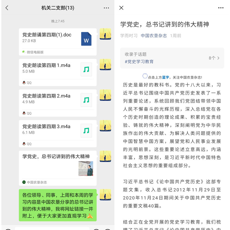 “各位領導、同事,上周和本周的學習內容是中國農墾分享的《總書記講到的偉大精神》,我將網址鏈接一并附上,便于大家更加直觀學習。”5月23日晚,新洋農場有限公司機關二支部黨建助理員在支部微信群里分享了支部黨史朗讀第四期,這是該支部創(chuàng)新黨史學習方式的一個舉措。