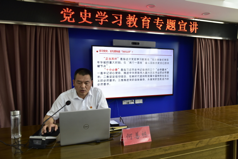 何善棟本次宣講的主題是《學習黨史守初心 汲取力量擔使命》。宣講中,他從學習黨史,要知道“為什么學”、“學什么”、“怎么學”三個大的方面進行了深入淺出的講解。他指出,學好黨史具有重要的現實意義,重視黨內集中教育是中國共產黨的一大特色,目的在于統一思想、凝聚人心、鍛煉黨性,更好地開展工作、解決現實問題。這次黨內集中教育的主題是學黨史,目的便是習近平總書記強調的“注重用黨的奮斗歷程和偉大成就鼓舞斗志、明確方向,用黨的光榮傳統和優良作風堅定信念、凝聚力量,用黨的實踐創造和歷史經驗啟迪智慧、砥礪品格”。可以說,在全黨集中開展黨史學習教育,正當其時,十分必要。