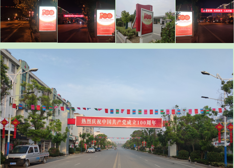 據了解,為了在黨的百年生日這一天,在農場淮海路上營造出濃郁的宣傳氛圍,農場公司通過建造一座跨路燈光宣傳橫幅標語,設置36座路邊黨史及軍墾文化的宣傳燈箱,在路燈之間懸掛“慶祝中國共產黨成立100周年”標識的彩旗,加上懸掛的標語、紅色喜慶的中國結燈飾和夜晚樓宇燈光秀的點綴,將慶祝建黨百年以燈光為主題的宣傳內容,有機融入農場小城鎮的氛圍環境中來讓淮海農場黨史學習教育宣傳更具特色,通過嶄新的小城鎮面貌,在淮海營造出喜迎中國共產黨成立100周年的良好氛圍