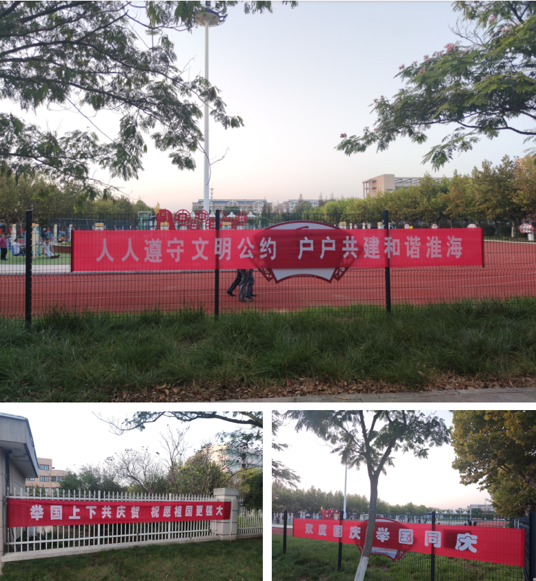 五星紅旗隨風招展,喜悅之情更是承載著人們對美好未來的向往。轄區升掛的國旗,懸掛國慶標語,文廣苑樓體上“人民有信仰 國家有力量 民族有希望”等主題宣傳標語等格外醒目,加上農場在各個廣場上開展的群眾性文化體育活動及廣大職工居民進行休閑健身的鏡頭,既呈現出了淮海職工居民在祖國大家庭懷抱里安定團結祥和的良好社會氛圍,也再一次激發著農場廣大黨員干部和職工群眾對黨、對祖國母親的無盡熱愛,昭示著廣大干部群眾在中國共產黨的領導下,感黨恩、聽黨話、跟黨走的信心和決心。圖為淮海在國慶期間懸掛的宣傳廣告橫幅。