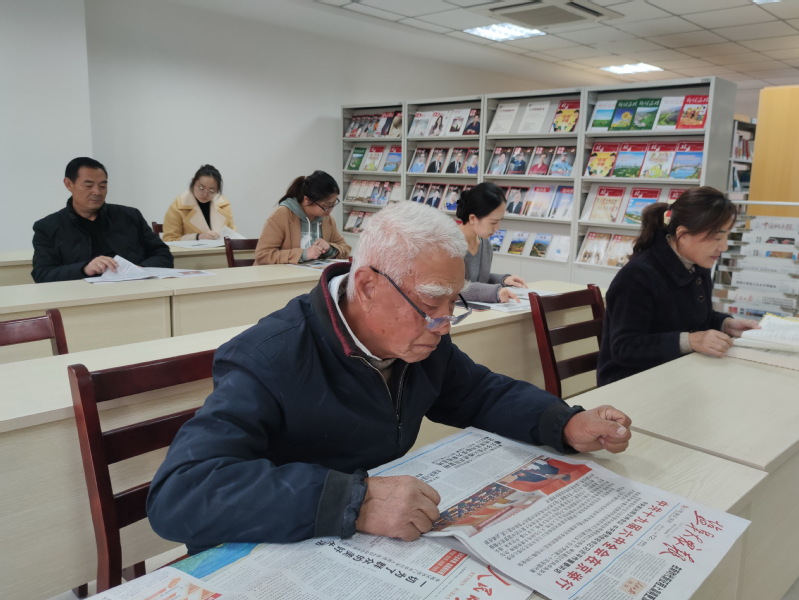 各基層黨支部即日起迅速以各種形式,掀起對六中全會精神進行學習討論和深化吸收?;春^r場社區充分發揮新時代文明實踐所的學習平臺地位,經常更新并充實職工書屋的書報藏書量,引導職工居民緊跟時代脈搏充電學習。圖為11月12日下午,幾名職工居民第一時間在書屋內認真觀看刊有黨的十九屆六中全會精神的報紙。