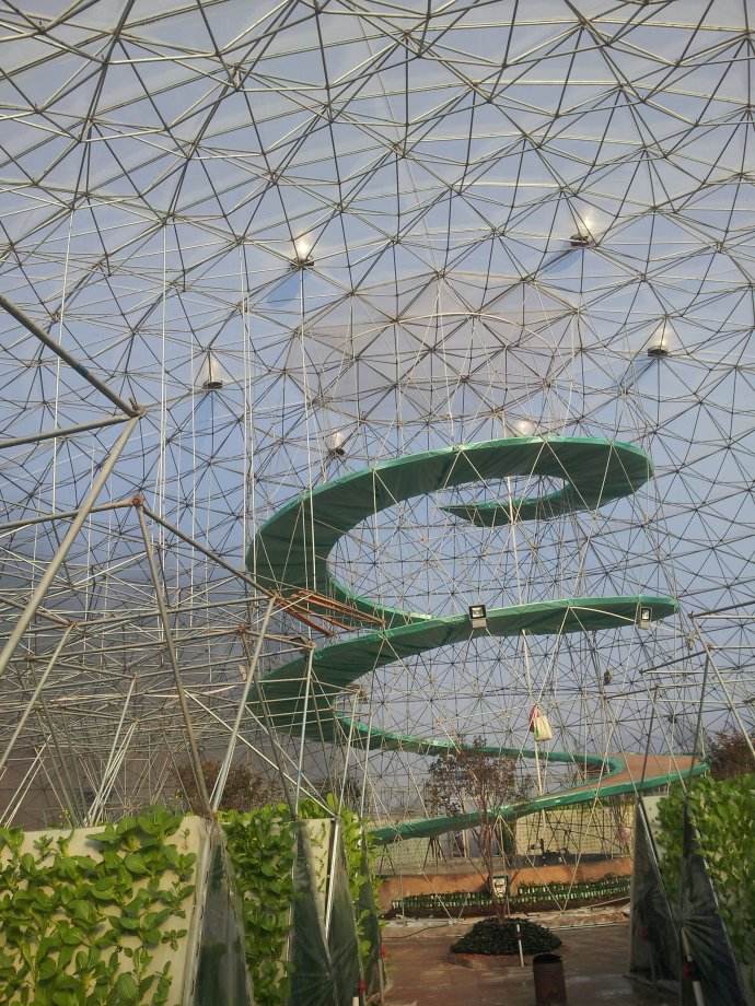 4.結構牢固性強:抗風:球體沒有正的迎風面,能分解從各個角度過來的強風??寡簻厥沂乔蝮w結構,利用三角交叉來構建溫室骨架,能發揮強大的雞蛋殼效應,能抗1米以下積雪。抗震:由于溫室是整體的結構,結合三角形構架,具有強大的抗震性。