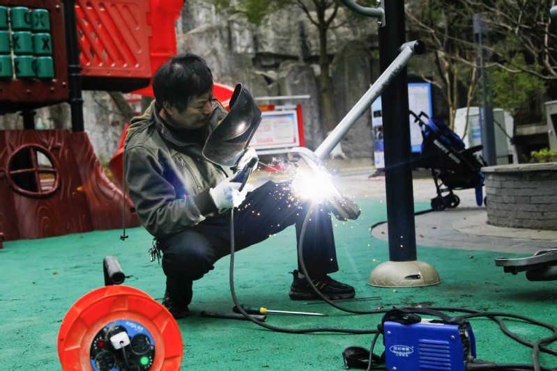 為了增強業主參與健身鍛煉的積極性,保證業主的健身安全,通宇公司旗下林景物業常態化開展健身器材的日常養護和專業維護,及時消除公共安全隱患,打通全民健身“最后一公里”。圖為林景雅園物業服務中心李師傅正在維修園區內的健身器材。