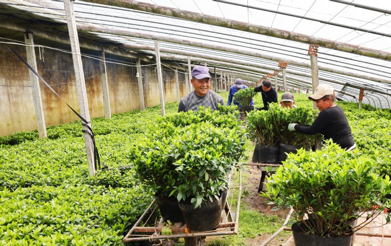 2024年4月4日,崗埠農場花農正在忙著銷售桅子花、風車花等盆栽花卉。近年來,崗埠農場積極引導職工發展鮮花經濟,努力實現企業、職工雙增收,助力鄉村振興。目前,種植梔子花達40余畝20萬盆,品種主要有雀舌梔、羅漢梔、牡丹梔、海凌梔和四季梔,最近一段時間來自山東、安徽、河南、上海及江蘇省內客戶上門訂購,平均日銷量近1萬盆。