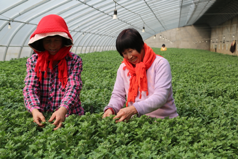 連日來。崗埠農場公司富民農業科技園加緊春耕生產工作,按照時令做好在棚作物管理。圖為3月19日,工人們在溫室大棚里,為菊花進行去頭作業,做好上市銷售前的準備工作。