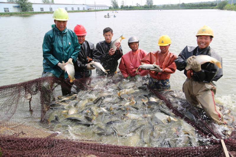 春放秋捕,共話(huà)豐收。走進(jìn)崗埠農(nóng)場(chǎng)公司南漁場(chǎng)的鯉魚(yú)養(yǎng)殖基地,一條條肥美的鯉魚(yú)不斷躍出水面,引起水花四濺。8月29日,崗埠農(nóng)場(chǎng)公司水產(chǎn)養(yǎng)殖中心迎來(lái)鯉魚(yú)“大豐收”,養(yǎng)殖基地內(nèi)熱鬧開(kāi)捕秋天第一網(wǎng)鯉魚(yú)。初秋的早晨已然涼意十足,早上不到6點(diǎn),天剛蒙蒙亮,捕撈人員就來(lái)到魚(yú)塘開(kāi)網(wǎng)起魚(yú)。在水產(chǎn)公司工作人員的指揮下,一張巨大的漁網(wǎng)隨著捕魚(yú)工人的移動(dòng)緩緩張開(kāi),大家不顧冰冷的水下溫度,緊張忙碌了起來(lái)。經(jīng)過(guò)鋪底、收網(wǎng)、聚攏等環(huán)節(jié)的共同協(xié)作,漁網(wǎng)被慢慢升起……整個(gè)現(xiàn)場(chǎng)一片繁忙熱鬧景象。經(jīng)過(guò)近三個(gè)小時(shí)的忙碌,在大家的精心分揀下,裝滿(mǎn)魚(yú)的筐子被吊車(chē)有序吊起,稱(chēng)重、記錄、放魚(yú)一氣呵成。“這個(gè)吊車(chē)頂部的黃色圓塊就是電子秤,吊起魚(yú)的同時(shí),秤上的信號(hào)就發(fā)到這個(gè)無(wú)線(xiàn)接收裝置上來(lái),秤重既方便又精準(zhǔn)。”現(xiàn)場(chǎng)記賬的方正解釋說(shuō)。“看這些魚(yú),品相好、質(zhì)量高,抓都抓不住,活蹦亂跳的,真是大豐收啊!”起魚(yú)的工人們雖然全身都已濕透,但是看著手里的大魚(yú),臉上洋溢著收獲的笑容。據(jù)悉,本次捕撈的鯉魚(yú)名叫“福安鯉”,在春季投放,采取訂單式捕撈銷(xiāo)售。當(dāng)天,2.2萬(wàn)斤“淮河牌”福安鯉被送上等候已久的運(yùn)輸車(chē),銷(xiāo)往本省徐州市及河南省等地。“養(yǎng)殖中心依托豐富水